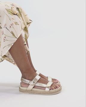 Flat woman's sandals. Gold nappa leather. Velcro Closure. Leather lining. Anatomical insole. Flexible and durable Polyurethane sole. Heel height: 4.5 cm. 100% Made in Spain.