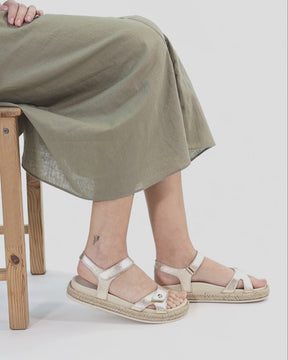 Flat woman's sandals. Gold nappa leather. Velcro Closure. Leather lining. Anatomical insole. Flexible and durable Polyurethane sole. Heel height: 4.5 cm. 100% Made in Spain.